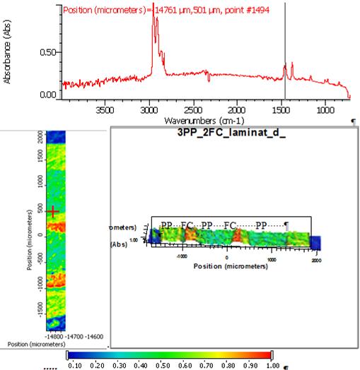 În cazul materialului laminat cu 3straturi de PP şi 2 straturi de FC se pot uşor evidenţia componentele materialului (2 straturi de FC şi 3 straturi de PP, distanţa relativă între cele două straturi de FC este de ~1mm iar grosimea materialului laminat ~3.5mm. Monitorizarea s-a facut după banda de absorbţie de la 1460cm-1.